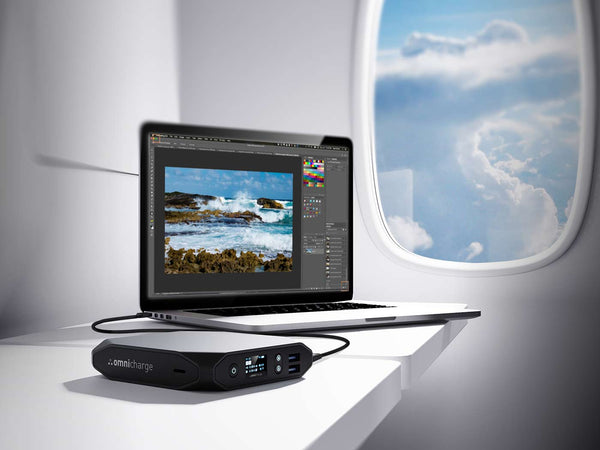 The Omni 20C+ can be brought with you in your carry-on luggage. It's capacity (20,00mAh/71Wh) falls well within the Federal Aviation Administration's safety limit of 100Wh.